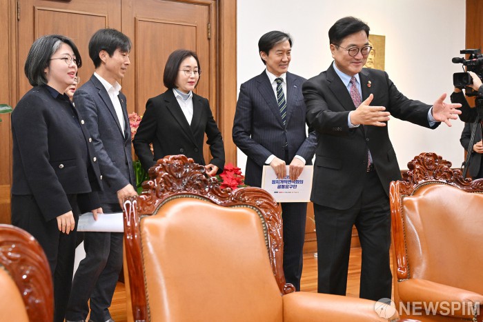 [서울=뉴스핌] 정일구 기자 = 우원식 국회의장이 11일 오전 국회 의장집무실에서 개혁진보 4당 정치개혁 연석회의 면담을 하기 위해 야4당 대표들과 이동하고 있다. 왼쪽부터 용해인 기본소득당 대표, 한창민 사회민주당 대표, 김재연 진보당 상임대표, 조국 조국혁신당 대표, 우원식 의장. 2025.12.11 mironj19@newspim.com