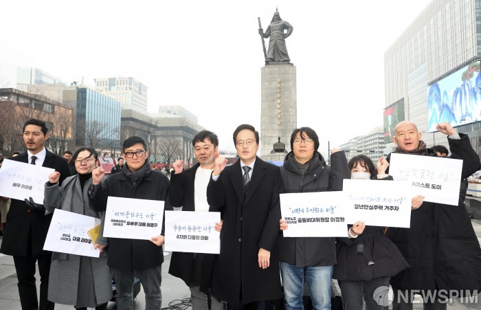 [서울=뉴스핌] 최지환 기자 = 박주민 더불어민주당 의원이 11일 오전 서울 종로구 광화문광장에서 서울시장 출마선언을 마치고 지지자들과 기념촬영을 하고 있다. 2025.12.11 choipix16@newspim.com