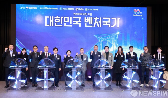 [서울=뉴스핌] 한성숙 중소벤처기업부 장관이 11일 서울 강남구 코엑스에서 열린 2025 벤처 미래 비전 포럼에서 참석자들과 기념촬영을 하고 있다. [사진=중소벤처기업부] 2025.12.11 photo@newspim.com