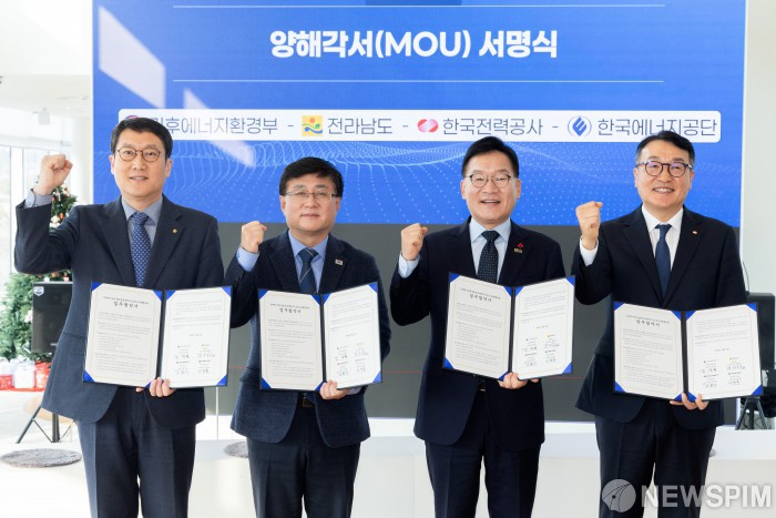 [서울=뉴스핌] 김성환 기후에너지환경부 장관이 11일 전남 해남군 솔라시도에서 열린 기후에너지 현장대응 추진단 출범식에서 전라남도, 한국전력, 한국에너지공단과 '기후위기 대응 강화 및 재생에너지 보급 가속화를 위한 업무 협약'을 체결한 뒤 기념촬영을 하고 있다. 왼쪽부터 이상훈 한국에너지공단 이사장, 김성환 장관, 강위원 전남도경제부지사, 서철수 한국전력 부사장. [사진=기후에너지환경부] 2025.12.11 photo@newspim.com