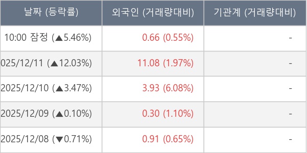 [서울=뉴스핌] 로보뉴스 = 12일 10시 15분 현재 드림씨아이에스(223250)는 전일 대비 5.46% (현재가 5,990원) 상승했고, 외국인이 최근 5일 연속 순매수(누적 16.89만 주, 잠정) 행진을 하고 있다.
