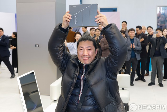 [서울=뉴스핌] 류기찬 기자 = 삼성전자의 두 번 접히는 '갤럭시 Z 트라이폴드' 첫 판매일인 12일 오전 서울 서초구 삼성 강남에서 1호 구매자가 박스를 들어보이고 있다. 2025.12.12 ryuchan0925@newspim.com