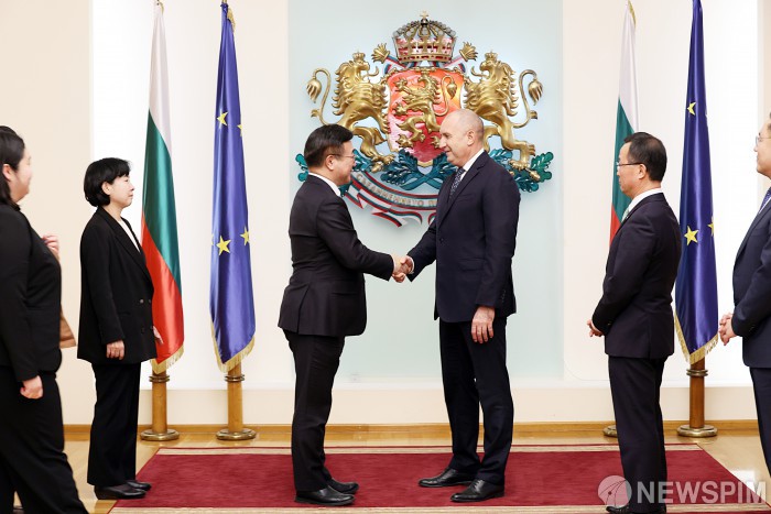 [서울=뉴스핌] 윤호중 행정안전부 장관이 11일 오후(현지시각) 불가리아 대통령궁에서 루멘 라데프 불가리아 대통령을 예방한 뒤 악수하고 있다. [사진=행정안전부] 2025.12.12 photo@newspim.com