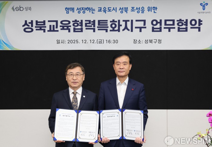 [서울=뉴스핌] 정근식 서울시교육감(왼쪽)과 이승로 성북구청장이 12일 오후 서울 성북구청에서 ‘성북교육협력특화지구’ 업무협약을 체결후 기념촬영하고 있다. 이번 협약을 통해 성북강북교육지원청과 성북구는 지역의 교육 환경과 인프라를 기반으로 특색있는 교육프로그램을 공동으로 운영할 예정이다. [사진=서울시교육청] 2025.12.12 photo@newspim.com