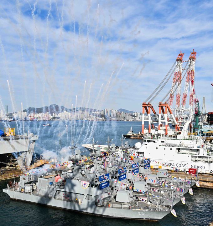 지난 8일 부산 HJ중공업에서 열린 신형 고속정(PKMR) 1~4번함 통합 진수식에서 진수를 축하하는 폭죽이 터지고 있다. [사진=해군 제공] 2025.12.13 gomsi@newspim.com
