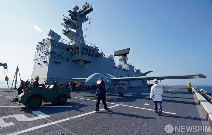 [포항=뉴스핌] 사진공동취재단 = 12일 포항 해상에 위치한 해군 독도함에서 실시된 '대형플랫폼 함정 무인기 운용 전투 실험' 에서 미국 제너럴 아토믹스(General Atomics)에서 개발 중인 고정익 무인기 모하비(Mojave)가 이륙을 준비하고 있다. 2024.11.13 photo@newspim.com