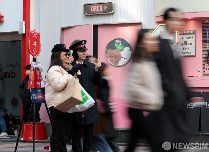 [서울=뉴스핌] 이길동 기자 =구세군 사관이 14일 오후 서울 명동거리에서 구세군 자선냄비에 성금을 넣은 외국인 관광객에게 구세군 모자를 씌워 주고 기념 촬영을 하고 있다. 2025.12.14. gdlee@newspim.com