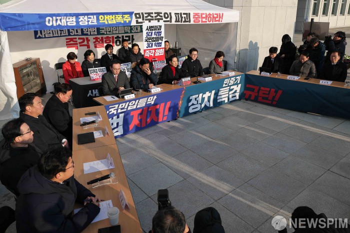 [서울=뉴스핌] 윤창빈 기자 = 장동혁 국민의힘 대표가 15일 서울 여의도 국회 본관 앞 천막에서 열린 최고위원회의에서 모두발언을 하고 있다. 2025.12.15 pangbin@newspim.com