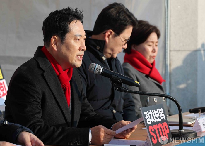 [서울=뉴스핌] 윤창빈 기자 = 장동혁 국민의힘 대표가 15일 서울 여의도 국회 본관 앞 천막에서 열린 최고위원회의에서 모두발언을 하고 있다. 2025.12.15 pangbin@newspim.com