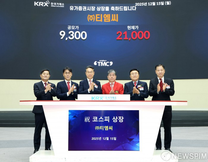 [서울=뉴스핌] 지영완 티엠씨 대표이사가 15일 서울 영등포구 한국거래소에서 열린 티엠씨 유가증권시장 상장기념식에서 참석자들과 현재가 확인 후 기념촬영을 하고 있다. 왼쪽부터 양태영 한국IR협의회 회장, 성주완 미래에셋증권 IB1부문대표, 정규일 한국거래소 유가증권시장본부장, 지 대표이사, 송무현 송현그룹 회장, 선우정택 한국상장회사협의회 부회장. [사진=한국거래소] 2025.12.15 photo@newspim.com