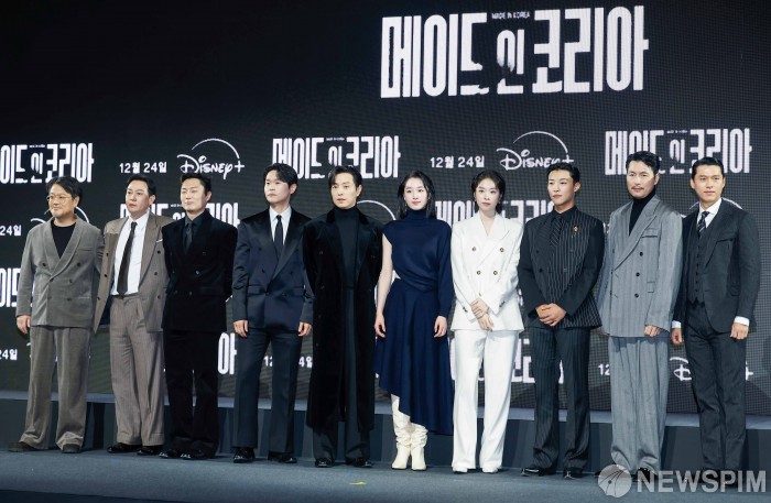 [서울=뉴스핌] 류기찬 기자 = 우민호 감독(왼쪽 첫번째)과 배우 현빈, 정우성 등 출연진들이 15일 오전 서울 강남구 그랜드인터컨티넨탈 서울파르나스에서 열린 디즈니+ 오리지널 시리즈 ‘메이드 인 코리아’ 제작발표회에서 포즈를 취하고 있다. 메이드 인 코리아는 1970년대 혼란과 도약이 공존했던 대한민국, 국가를 수익모델로 삼아 부와 권력의 정점에 오르려는 사내 백기태(현빈)와 그를 끝까지 추적하는 검사 장건영(정우성)이 시대를 관통하는 거대한 사건들과 직면하는 이야기를 그린 작품이다. 2025.12.15 ryuchan0925@newspim.com