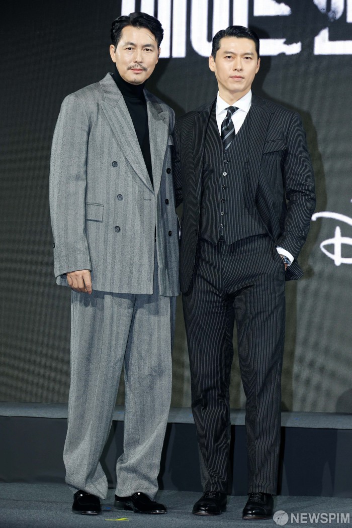 [서울=뉴스핌] 류기찬 기자 = 배우 정우성, 현빈이 15일 오전 서울 강남구 그랜드인터컨티넨탈 서울파르나스에서 열린 디즈니+ 오리지널 시리즈 ‘메이드 인 코리아’ 제작발표회에서 포즈를 취하고 있다. 메이드 인 코리아는 1970년대 혼란과 도약이 공존했던 대한민국, 국가를 수익모델로 삼아 부와 권력의 정점에 오르려는 사내 백기태(현빈)와 그를 끝까지 추적하는 검사 장건영(정우성)이 시대를 관통하는 거대한 사건들과 직면하는 이야기를 그린 작품이다. 2025.12.15 ryuchan0925@newspim.com