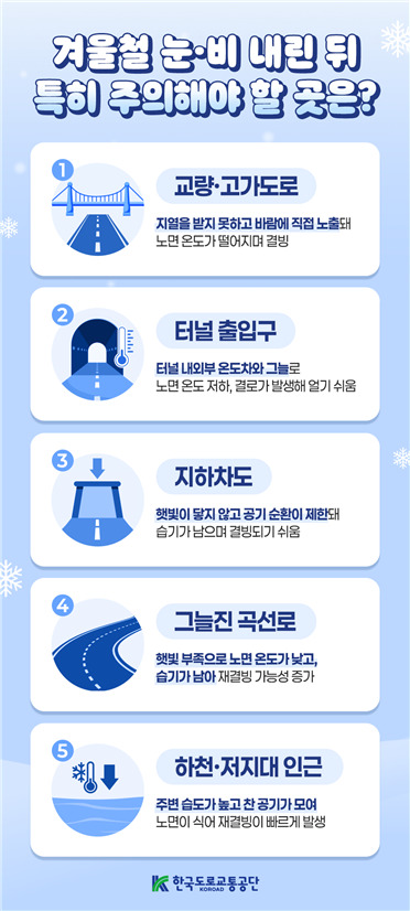 교량과 고가도로는 구조상 지열을 받지 못하고 찬 공기에 노출돼 있어 눈이나 비가 지표면보다 빨리 얼어붙고 쉽게 녹지 않는다.