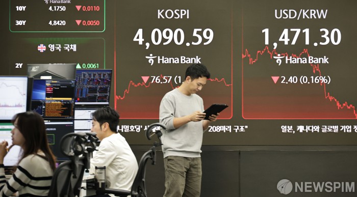 [서울=뉴스핌] 양윤모 기자 = 15일 오후 코스피가 전장 종가보다 76.57 포인트(1.84%) 하락하며 4090.59로, 코스닥은 1.49 포인트(0.16%) 상승한 938.83으로 장을 마감한 가운데, 서울 중구 하나은행 딜링룸에서 직원들이 업무를 보고 있다. 서울외환시장에서 달러/원 환율은 전장 대비 2.40원 하락한 1471.30원에 주간거래를 마감했다. 2025.12.15 yym58@newspim.com