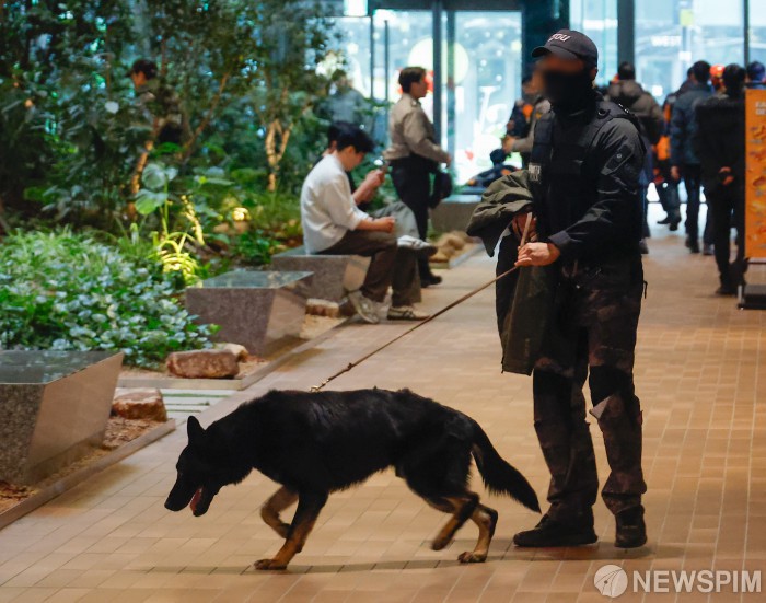[성남=뉴스핌] 류기찬 기자 = 15일 오후 경기 성남시 분당구 카카오 판교 사옥에 폭발물이 설치됐다는 협박 신고가 접수된 가운데 경찰 특공대가 수색을 벌이고 있다. 2025.12.15 ryuchan0925@newspim.com
