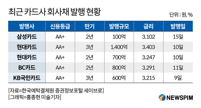 실제 카드사들의 조달비용도 빠르게 늘고 있다. 한국예탁결제원 증권정보포털 '세이브로'에 따르면 현대카드(AA+)가 지난 10일 발행한 3년 만기 1400억원 규모 회사채 금리는 3.403%, 2년 만기 700억원 규모 회사채는 3.247%로 집계됐다. BC카드(AA+) 역시 지난 11일 2년 만기 800억원 규모 회사채를 3.291%로 발행했다. 불과 한 달 전까지만 해도 2%대 발행이 가능했지만 시장금리 상승으로 발행금리가 1%포인트 가까이 뛰었다.