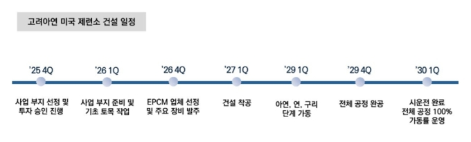 고려아연은 2026년 부지 조성 및 기반 공사, 설계·조달·시공(EPC) 업체 선정과 주요 장비 발주를 진행할 계획이다. 2027년 착공을 시작으로 2029년 제련소 완공을 목표로 하고 있으며, 아연과 연, 동 공정 순으로 단계적 가동에 들어간다.