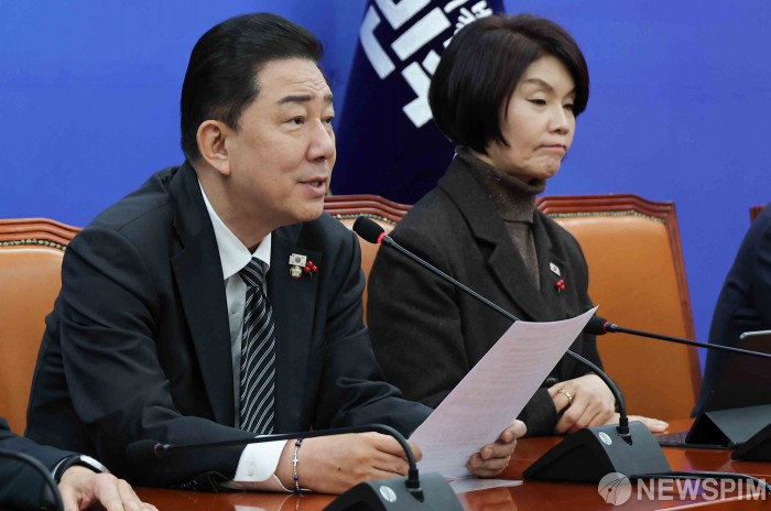 [서울=뉴스핌] 윤창빈 기자 = 김병기 더불어민주당 원내대표가 16일 서울 여의도 국회에서 열린 원내대책회의에서 모두발언을 하고 있다. 2025.12.16 pangbin@newspim.com