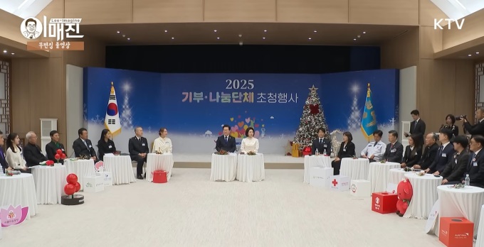 연말연시 맞아 이웃을 살피고 돕는 기부·나눔 문화 확산과 관심 촉구를 위해 15개 단체장과 홍보대사를 초청했다고 대통령실은 전했다. 이 대통령 부부는 각 단체에 성금을 기부하고 사연을 나눴다.
