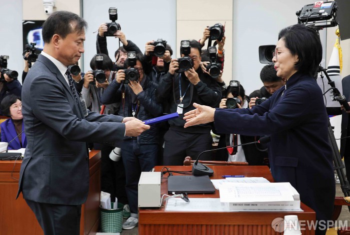 [서울=뉴스핌] 윤창빈 기자 = 김종철 방송미디어통신위원장 후보자가 16일 서울 여의도 국회 과학기술정보방송통신위원회 전체회의에서 열린 인사청문회에서 최민희 위원장에게 선서문을 전달하고 있다. 2025.12.16 pangbin@newspim.com