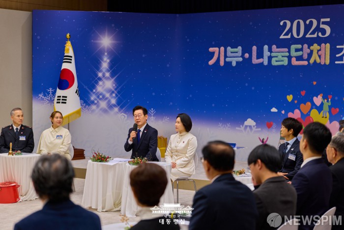 [서울=뉴스핌] 이재명 대통령이 16일 서울 용산 대통령실에서 열린 2025년 기부·나눔단체 초청행사에서 인사말을 하고 있다. [사진=대통령실] 2025.12.16 photo@newspim.com