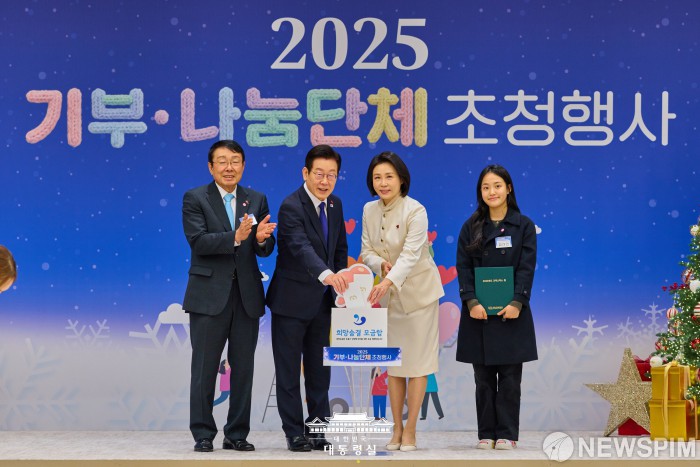 [서울=뉴스핌] 이재명 대통령과 김혜경 여사가 16일 서울 용산 대통령실에서 열린 2025년 기부·나눔단체 초청행사에서 대한결핵협회에 성금을 전달하고 있다. [사진=대통령실] 2025.12.16 photo@newspim.com