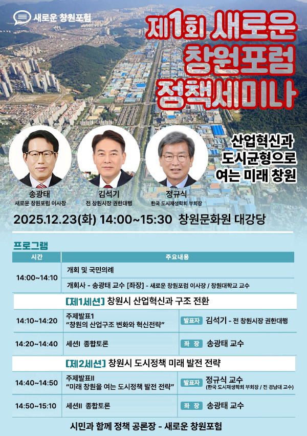 [창원=뉴스핌] 남경문 기자 = 새로운 창원포럼은 오는 23일 창원문화원 대강당에서 창원시의 산업·도시 현안을 진단하고 미래 전략을 모색하는 제1회 정책세미나를 개최한다고 17일 밝혔다.