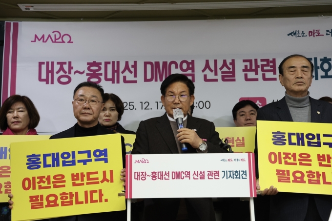 [서울=뉴스핌] 이경화 기자 = 서울 마포구는 17일 오후 중구 상연재에서 기자회견을 열고 DMC 환승역이 제외된 대장홍대선에 대한 우려를 표명하며 DMC역 신설을 강력히 촉구했다. 또 일부 정치권이 주장한 지자체 원인자 부담 설치는 현실성이 없다고 지적했다.