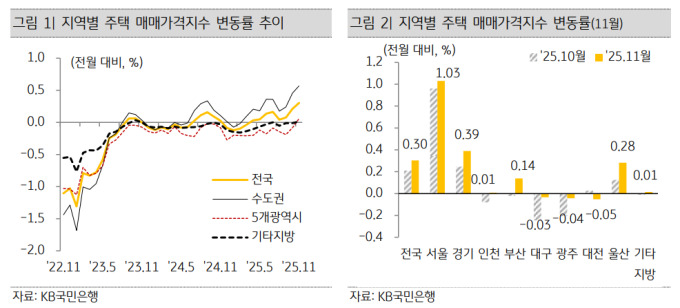 17일 KB경영연구소에 따르면 지난 11월 전국 주택 매매가격은 전월 대비 0.30% 상승했다. 수도권과 비수도권 모두 10월보다 상승 폭이 확대된 가운데 수도권은 10월 0.46%에서 11월 0.57%로 늘었다. 비수도권도 5개 광역시가 40개월 만에, 기타 지방은 4개월 만에 상승 전환했다.