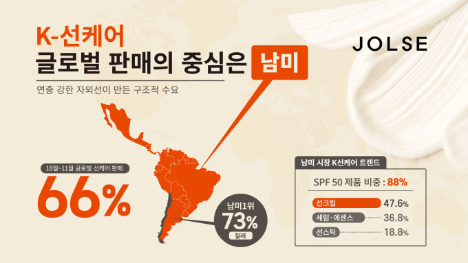 ㈜바른손(대표 강신범)이 운영하는 K 뷰티 엑셀러레이터 플랫폼 '졸스(Jolse)'가 올해 10~11월 글로벌 선케어 판매 데이터를 분석한 결과, 남미 시장이 전체의 66%를 차지하며 가장 높은 수요를 보였다.