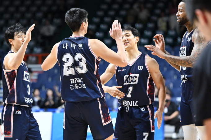 KCC 선수들이 18일 가스공사전을 승리한 뒤 하이파이브를 하며 기뻐하고 있다. [사진=KBL]