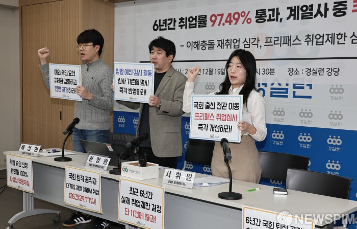 [서울=뉴스핌] 양윤모 기자 = 경실련이 19일 오전 경실련 강당에서 국회의원 등 국회 공직자의 퇴직 후 취업현황 발표 기자회견을 개최했다. 경실련은 2020년부터 2025년까지 최근 6년간 국회의원, 보좌진, 사무처 직원 등 국회 공직자 취업심사 438건을 전수 분석 결과, 국회 공직자의 취업제한 심사제도는 사실상 ‘유명무실’한 통과 의례로 전락했음이 드러났다고 주장했다. 행사에는 배정현 정치입법팀 간사, 권향원 정부개혁위원회 위원(아주대 행정학과 교수), 서휘원 정치입법팀 팀장이 참석했다. 2025.12.19 yym58@newspim.com
