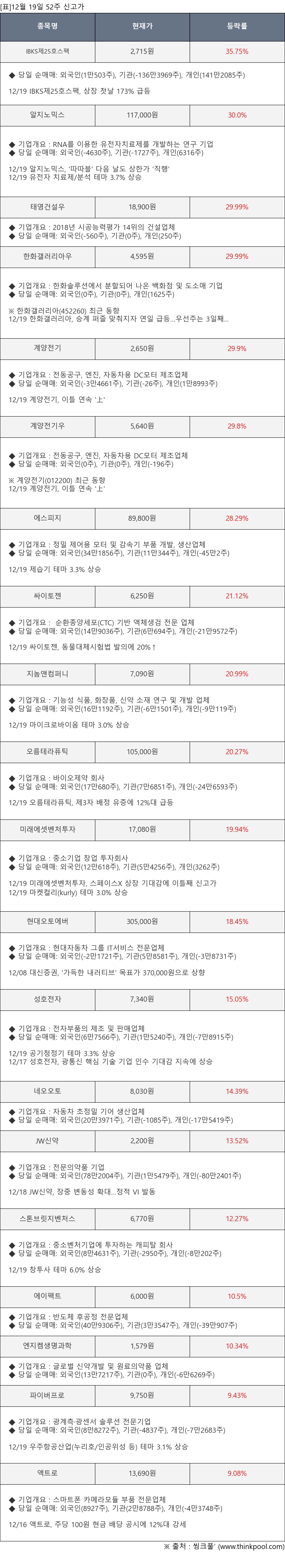 [표]12월 19일 52주 신고가 종목 및 최근 동향