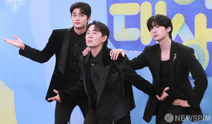 [서울=뉴스핌] 이형석 기자 = 방송인 김재원, 붐, 안재현이 20일 오후 서울 여의도 KBS에서 열린 연예대상 시상식 포토월에서 포즈를 취하고 있다. 2025.12.20 leehs@newspim.com
