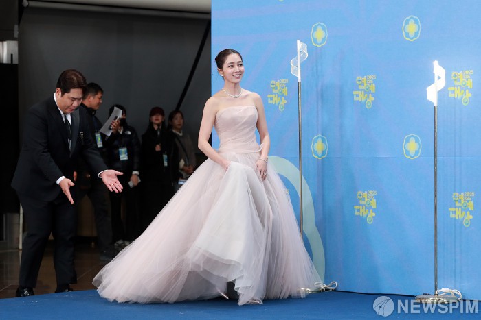 [서울=뉴스핌] 이형석 기자 = 배우 이민정이 20일 오후 서울 여의도 KBS에서 열린 연예대상 시상식 포토월에 참석하고 있다. 2025.12.20 leehs@newspim.com