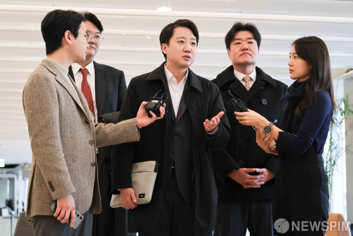 [서울=뉴스핌] 윤창빈 기자 = 이준석 개혁신당 대표가 윤석열 전 대통령의 공천개입 의혹과 관련한 조사를 받기 위해 21일 서울 종로구 KT광화문빌딩 웨스트에 마련된 민중기 특별검사팀에 출석하며 취재진의 질문에 답변하고 있다. 2025.12.21 pangbin@newspim.com