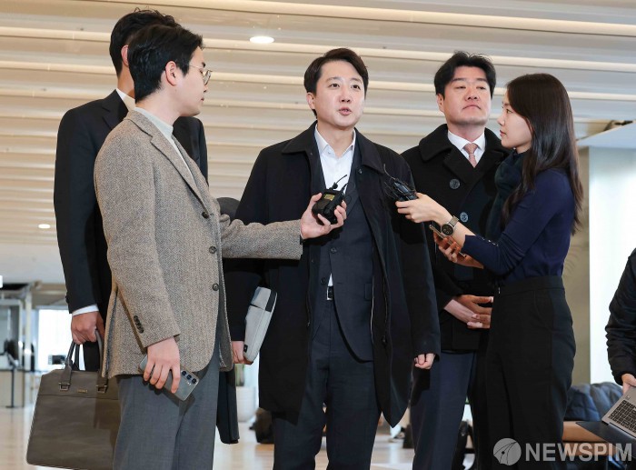 [서울=뉴스핌] 윤창빈 기자 = 이준석 개혁신당 대표가 윤석열 전 대통령의 공천개입 의혹과 관련한 조사를 받기 위해 21일 서울 종로구 KT광화문빌딩 웨스트에 마련된 민중기 특별검사팀에 출석하며 취재진의 질문에 답변하고 있다. 2025.12.21 pangbin@newspim.com
