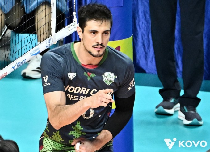 [서울=뉴스핌] 박상욱 기자 = 우리카드 아라우조가 21일 V리그 남자부 KB손해보험과의 3라운드 경기에서 득점을 올리고 자신만만한 제스처를 취하고 있다. [사진=KOVO]2025.12.21 psoq1337@newspim.com