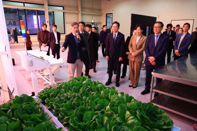 송미령 농식품부 장관과 배경훈 과학기술부총리는 22일 충남 천안 연암대학교 스마트팜 연구 현장을 찾아 '농식품 기술·산업 AX(AI+X) 촉진을 위한 정책 간담회'를 공동 주재했다. 간담회는 농업 자동화 기술 연구시설인 그린테크이노베이션센터에서 열렸다.