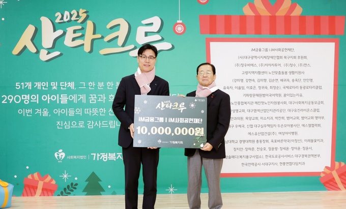 [서울=뉴스핌] 정광연 기자 = iM금융그룹 iM사회공헌재단(이사장 황병우)은 지난 19일 대구시 북구에 소재한 대불노인복지관에서 지역 아동들에게 맞춤형 소원 선물과 희망 메시지 전달을 위한 '2025 산타크루' 행사에 참여해 후원금을 전달했다고 22일 밝혔다.
