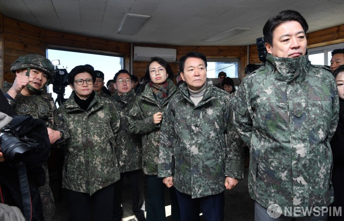 [서울=뉴스핌] 국회사진기자단 = 22일 강원 인제군 12사단 향로봉경계작전중대를 방문한 성일종 국회 국방위원장 등 국방위 의원들이 브리핑을 듣고 있다. 2025.12.22 photo@newspim.com