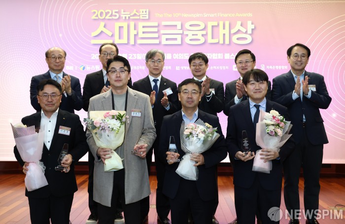 [서울=뉴스핌] 최지환 기자 = 23일 오전 서울 영등포구 금융투자협회에서 뉴스핌 주최로 열린 2025 뉴스핌 스마트금융대상에서 유근석 뉴스핌 대포를 비롯한 참가자들이 기념촬영을 하고 있다. 왼쪽 윗줄부터 시계방향으로 유근석 대표, 김경민 전국은행연합회 본부장, 이종오 금융감독원 부원장보, 임병화 성균관대 교수, 최종수 손해보험협회 본부장, 조윤서 여신금융협회 본부장, 김준식 신한카드 본부장, 임재필 DB손해보험 파트장, 양승기 삼성화재 파트장, 이준호 KB국민은행 상무. 2025.12.23 choipix16@newspim.com