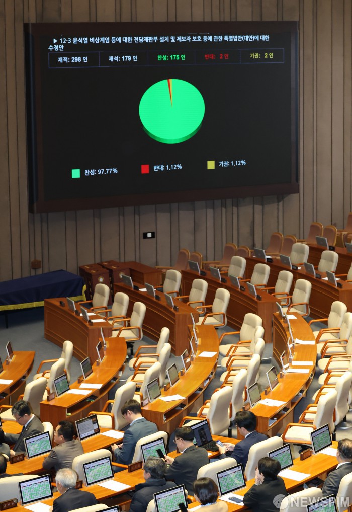 [서울=뉴스핌] 정일구 기자 = 23일 서울 여의도 국회에서 열린 본회의에서 12·3 윤석열 비상계엄 등에 대한 전담재판부 설치 및 제보자 보호 등에 관한 특별법안(대안)에 대한 수정안이 가결되고 있다. 2025.12.23 mironj19@newspim.com