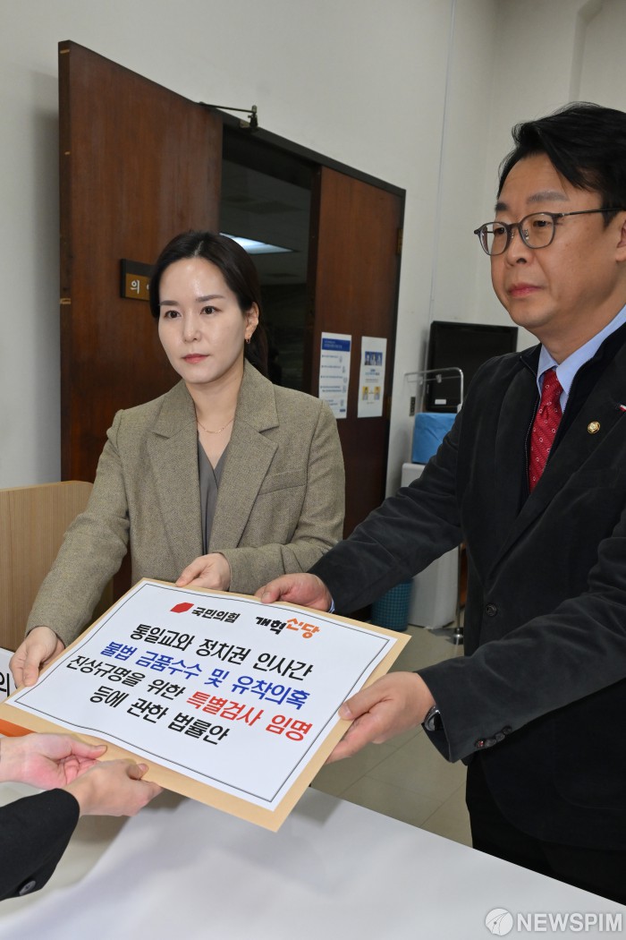[서울=뉴스핌] 정일구 기자 = 곽규택 국민의힘 원내수석대변인과 이주영 개혁신당 정책위의장이 23일 오후 서울 여의도 국회에서 통일교와 정치권 인사간 불법 금품수수 및 유착의혹 진상규명 특검법을 의안과에 공동 제출하고 있다. 2025.12.23 mironj19@newspim.com