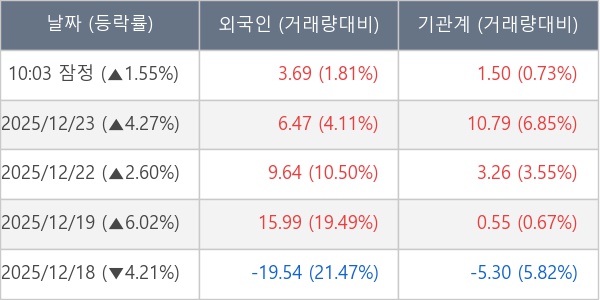 [서울=뉴스핌] 로보뉴스 = 24일 10시 15분 현재 한화엔진(082740)은 외국인과 기관이 각각 3.69 만 주, 1.50 만 주 순매수(잠정) 하면서 전일 대비 1.55% (현재가 45,900원) 상승하고 있다.