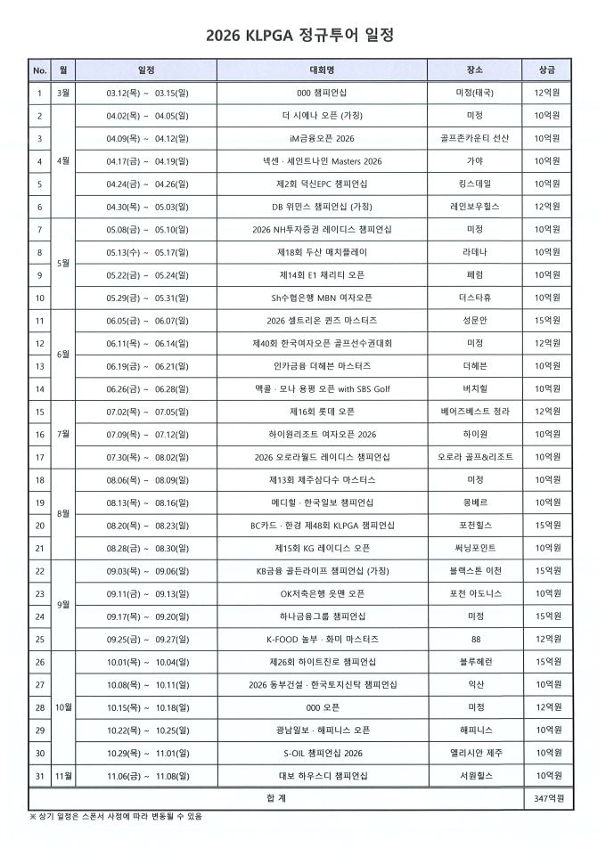 2026 KLPGA 투어, '역대 최대' 31개 대회 총상금 347억