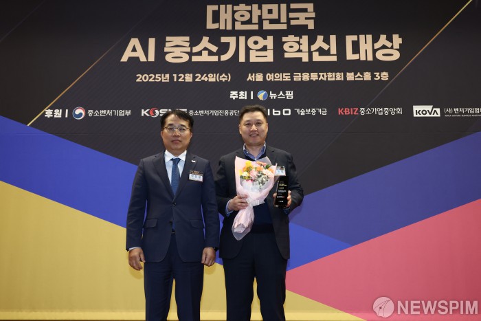 [서울=뉴스핌] 최지환 기자 = 정운열 중소기업중앙회 디지털혁신본부장이 24일 오전 서울 영등포구 금융투자협회에서 뉴스핌 주최로 열린 대한민국 AI 중소기업 혁신 대상에서 김종래 원포유 전무에게 중소기업중앙회 회장상을 시상하고 함께 기념촬영을 하고 있다. 2025.12.24 choipix16@newspim.com