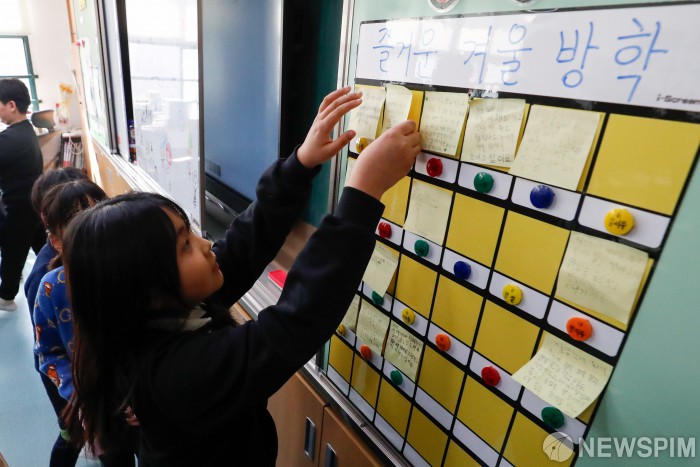 [서울=뉴스핌] 류기찬 기자 = 24일 오후 서울 동대문구 서울안평초등학교에서 열린 겨울방학식에서 학생들이 겨울방학 계획을 게시대에 부착하고 있다. 2025.12.24 ryuchan0925@newspim.com