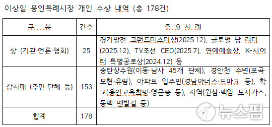 이상일 시장은 개인 자격으로 25건의 표창을 수상했고, 공공기관·협회·주민단체·아파트 입주자대표 등으로부터 감사패 153건을 받은 것으로 집계됐다.