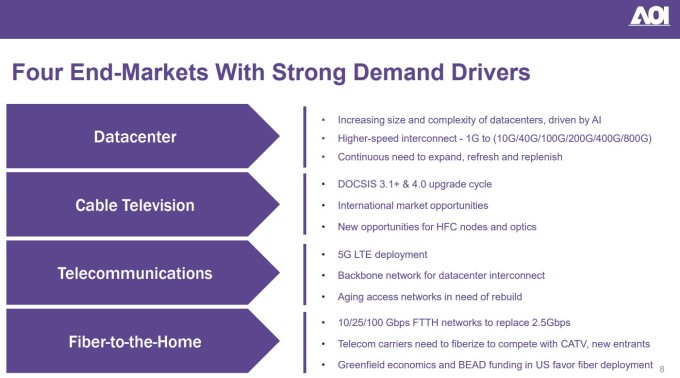그는 "어플라이드 옵토일렉트로닉스는 수년간 개발해온 자동화 생산 라인을 통해 대량 트랜시버 공급 요구를 충족할 수 있는 독보적인 위치에 있다"며 "이번 주문으로 우리는 연말까지 800G 출하 목표를 달성할 수 있을 것으로 예상하며, 4분기 총매출에 400만~800만 달러의 기여가 가능할 것"이라고 덧붙였다.